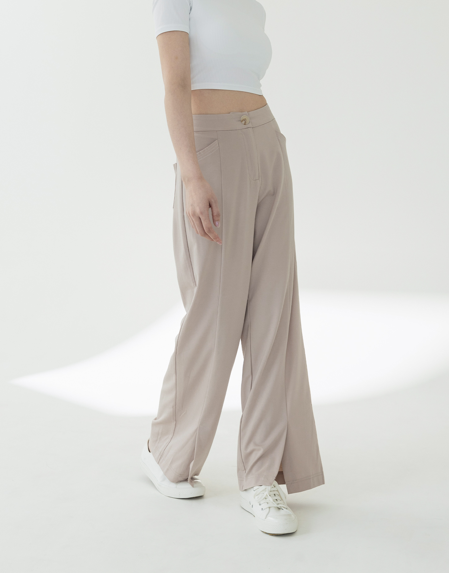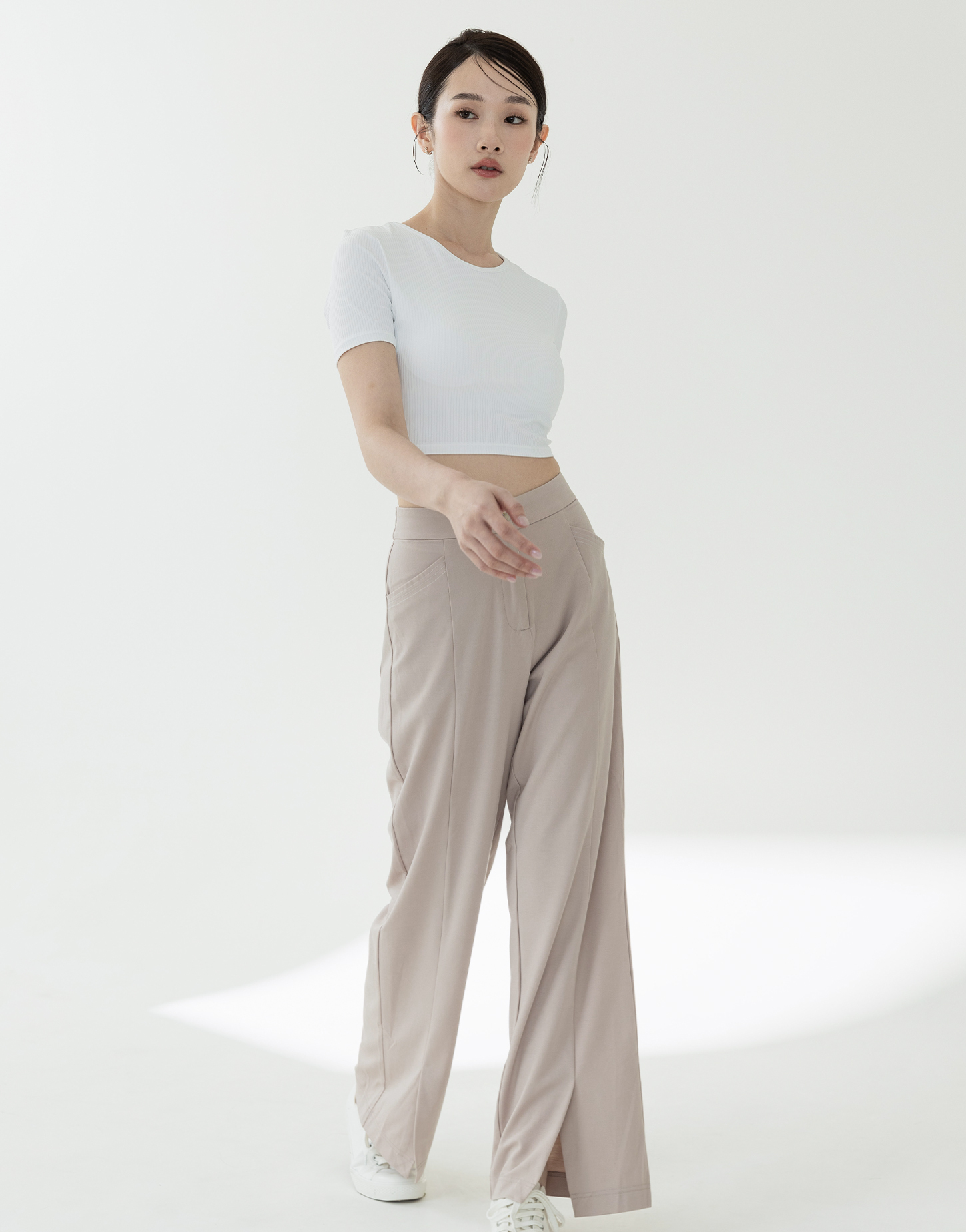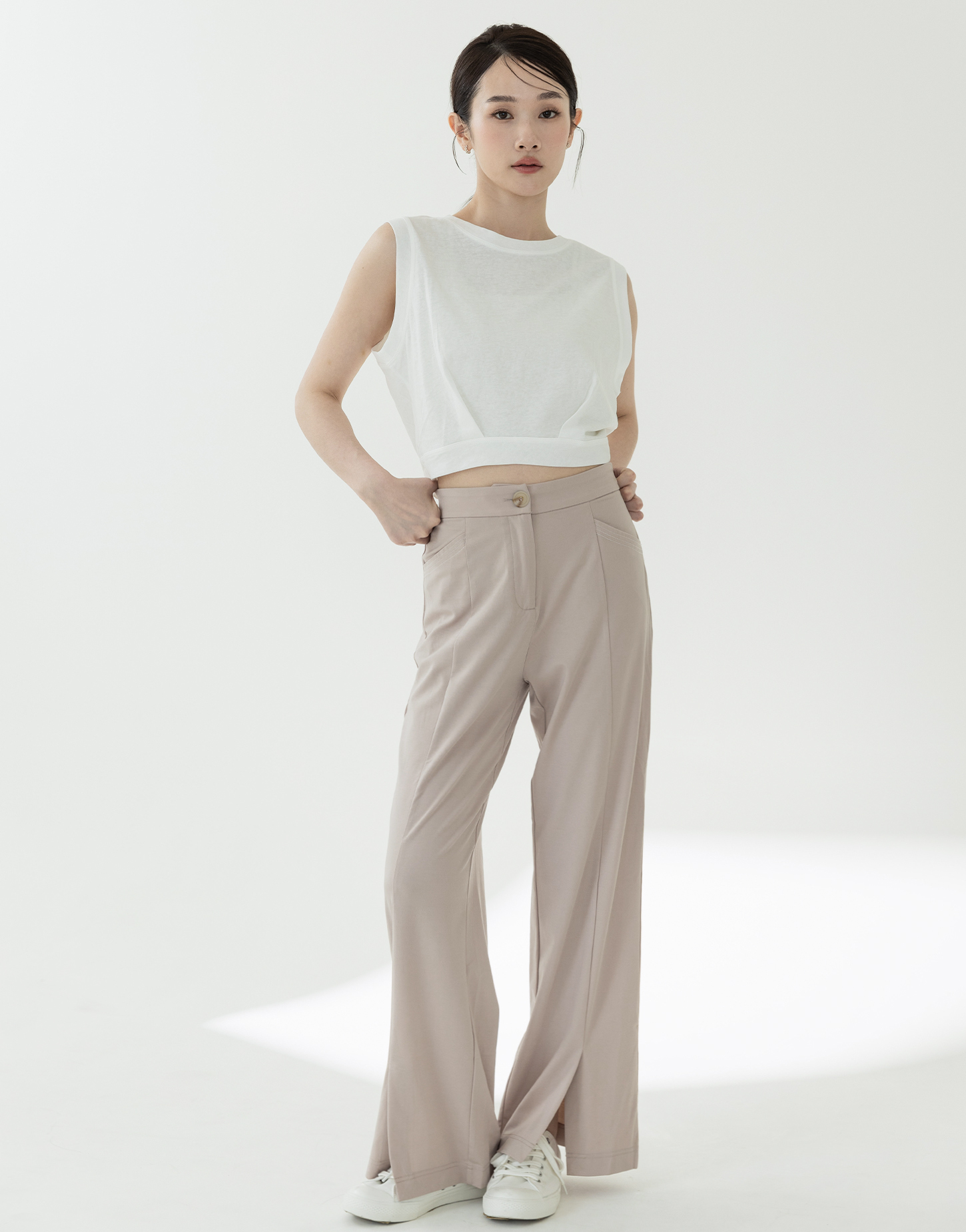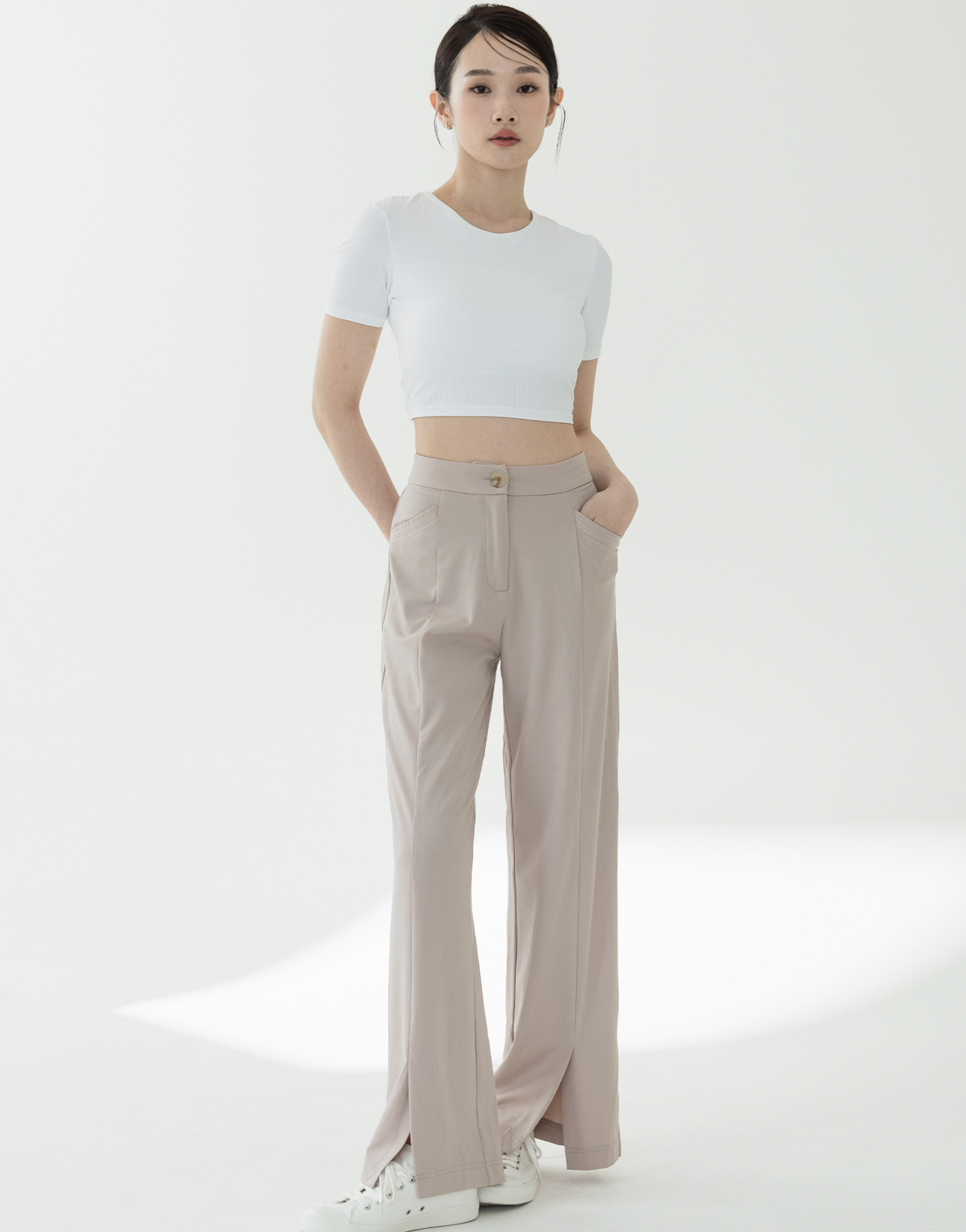 配上中高腰褲頭與開岔褲腳,讓妳的腿長該在的在,還多了上下兩段的長度,實現胸部以下都是腿。