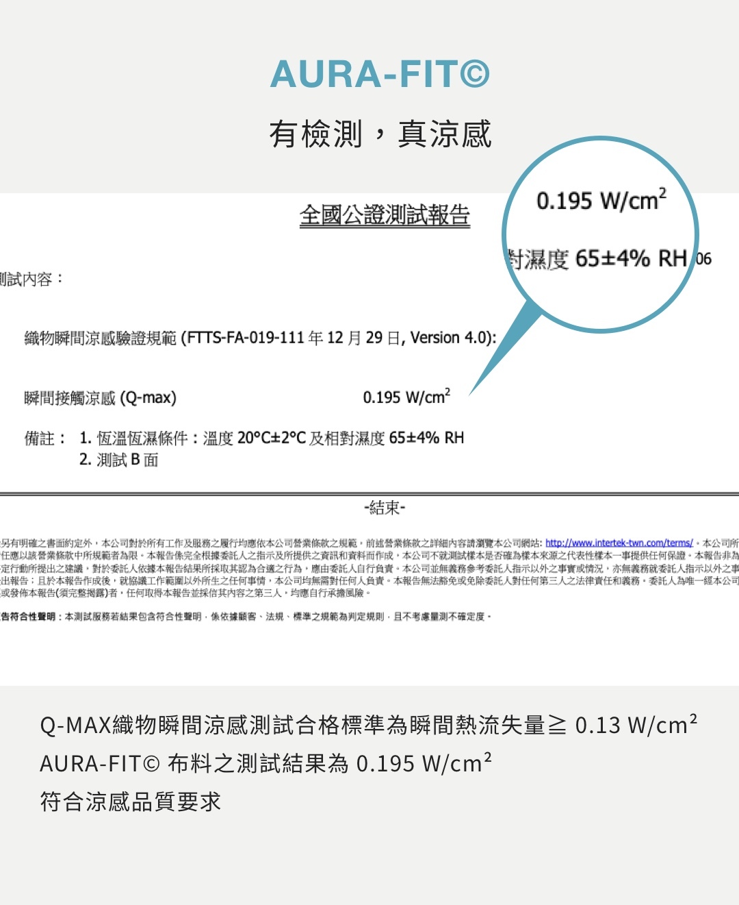 而 AURA-FIT© 布料之測試結果為 0.195 W/cm²,符合瞬間涼感效果的品質要求。