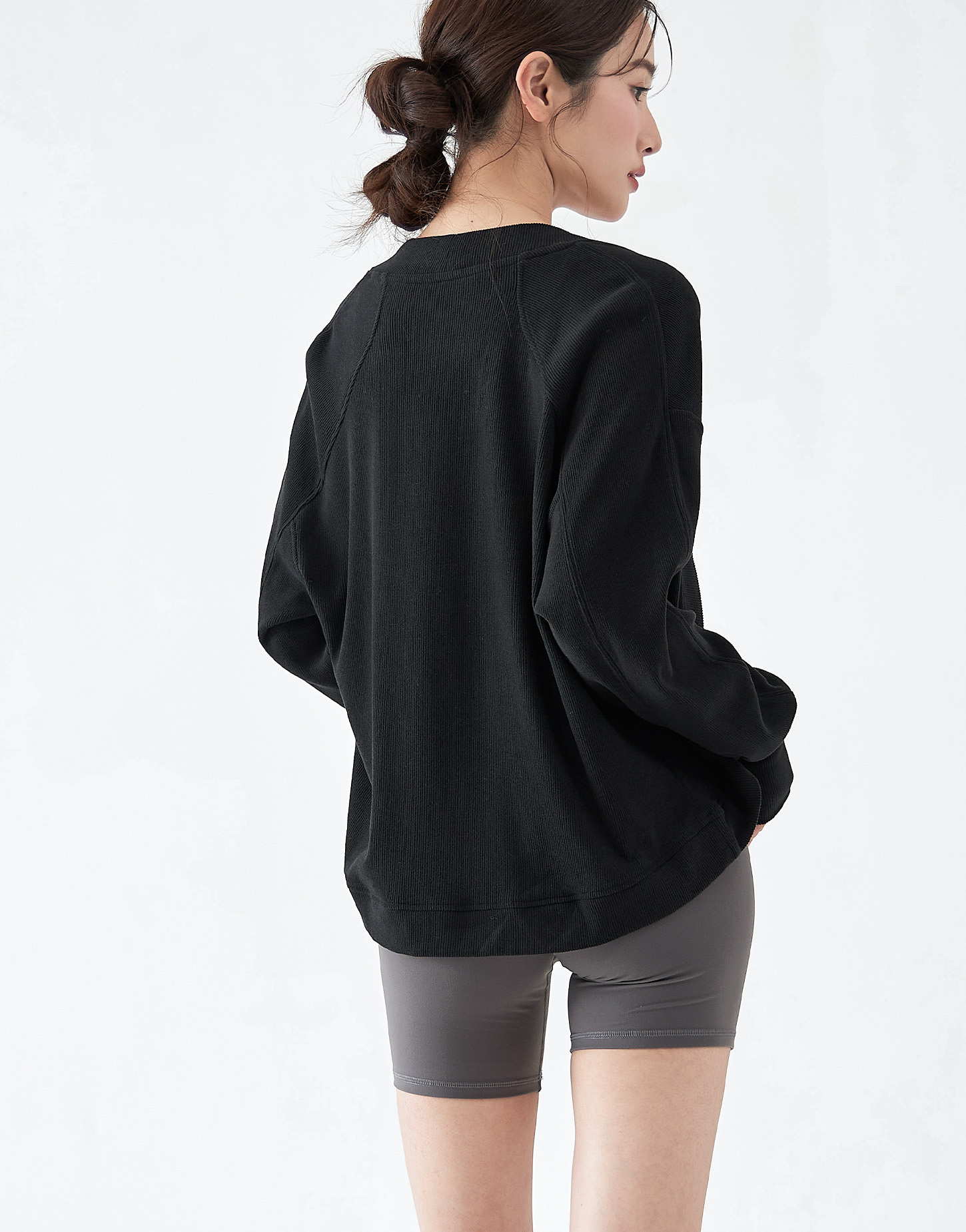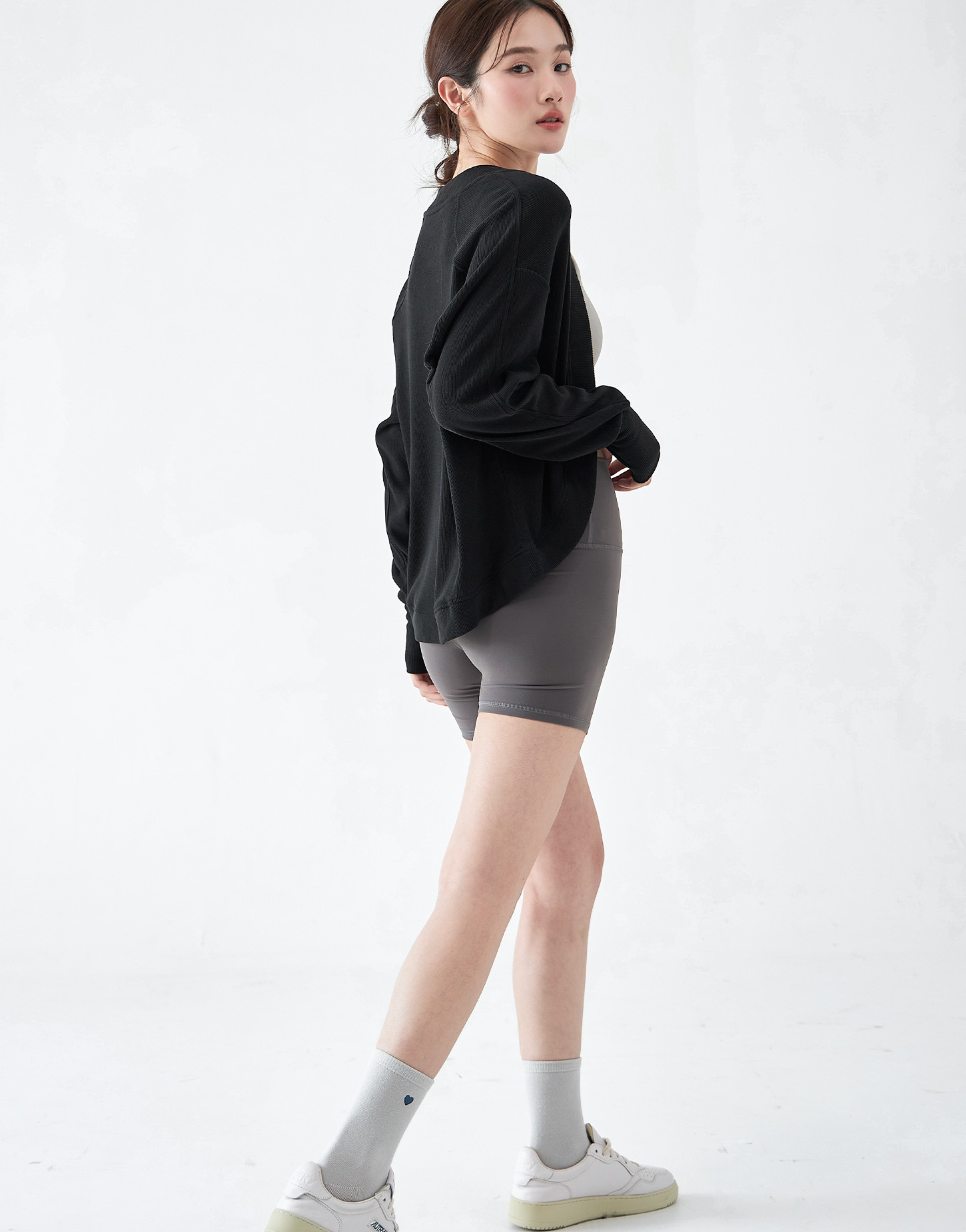落肩版型讓整體線條多了一點慵懶感,穿起來輕鬆自在;袖口的固定縮口設計則讓袖長能依需求調整,運動時也不會滑動。
